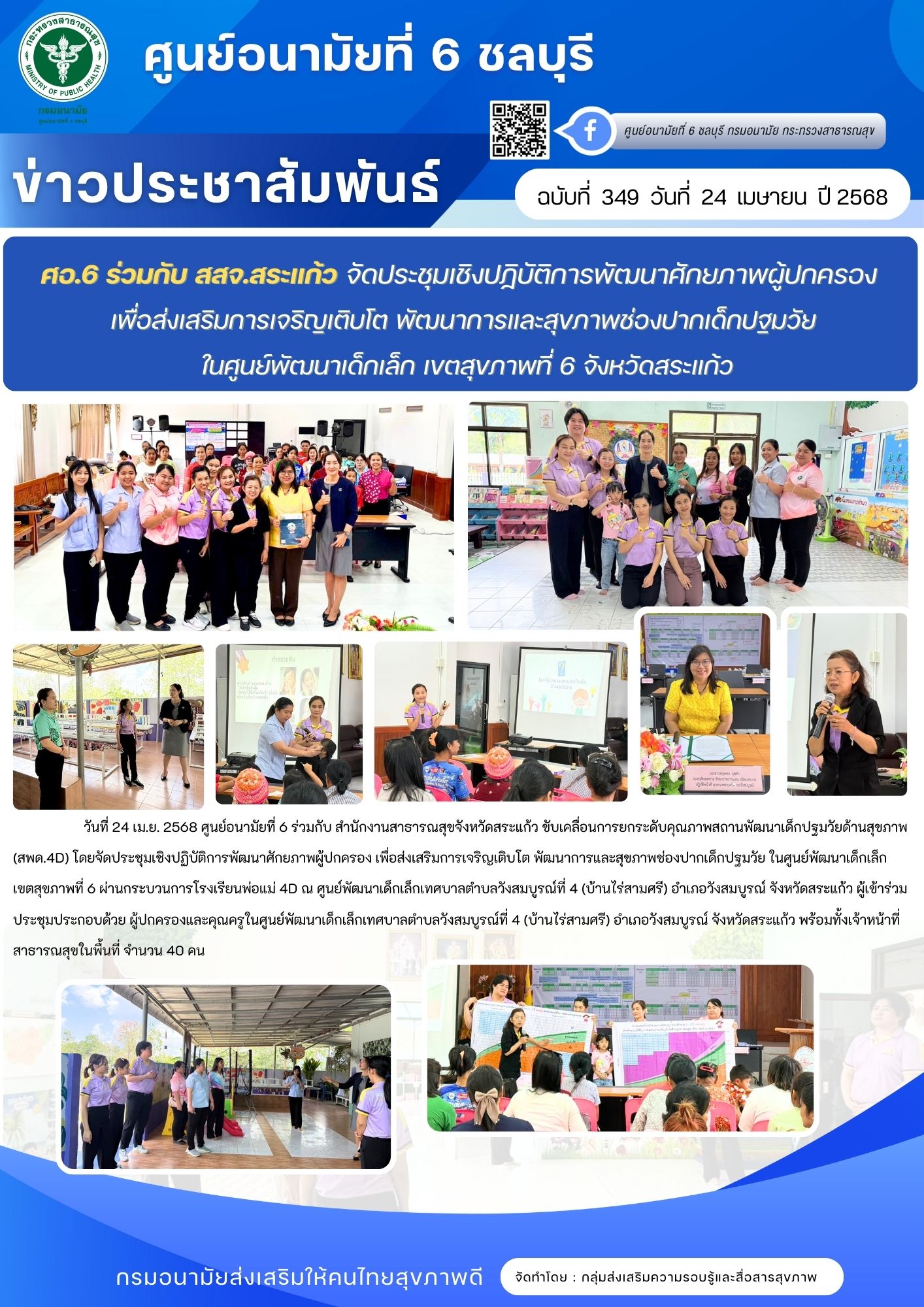 อ.6 ร่วมกับ สสจ.สระแก้ว จัดประชุมเชิงปฏิบัติการพัฒนาศักยภาพผู้ปกครอง เพื่อส่งเสริมการเจริญเติบโต พัฒนาการและสุขภาพช่องปากเด็กปฐมวัย ในศูนย์พัฒนาเด็กเล็ก เขตสุขภาพที่ 6 จังหวัดสระแก้ว